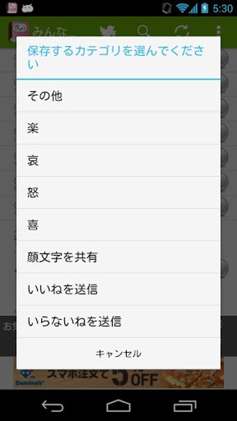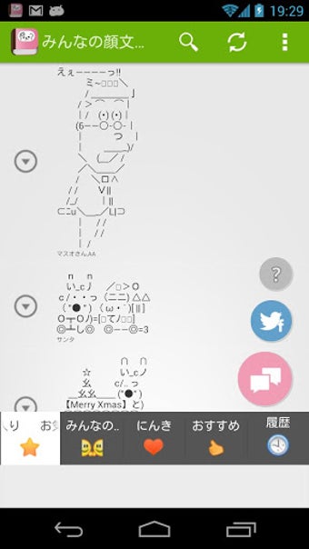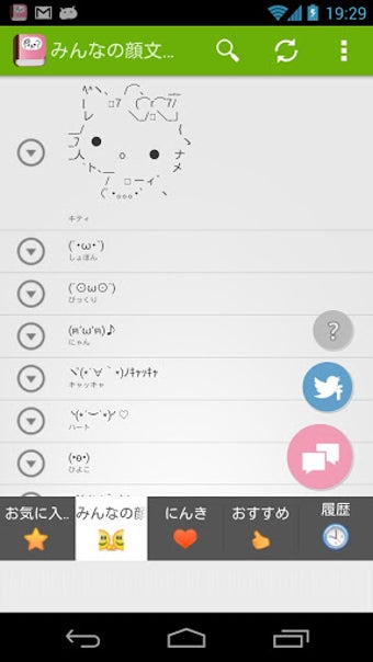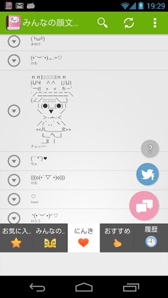 みんなの顔文字辞典に収録されている顔文字を1回タップするとコピーされるので、そのまま簡単にメッセージや投稿の記入欄に貼り付けられます。また、TwitterやFacebookのアカウントを連動させると、アプリ内で投稿文が作成できます。画面をわざわざ切り替えずにラクラク投稿できるので、TwitterとFacebookによく投稿する人は、連動させると良いでしょう。